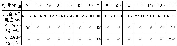 一般采用標(biāo)準(zhǔn)緩沖溶液來檢驗。辦法是:先用PH6.86的標(biāo)準(zhǔn)溶液校準(zhǔn)中性點(PH7附近),變送器輸出應(yīng)為12mA(4-20mA)或5mA(0-10mA時),誤差通過調(diào)整定位電位器消除。(調(diào)電路上的“O“電位器,順時針增大,逆時針減少)。再用PH4.01標(biāo)準(zhǔn)溶液檢驗酸性點,變送器輸出為4.01×1.142+4=8.58mA(4-20mA時)誤差通過調(diào)整斜率電位器來消除。(調(diào)電路上的”S”電位器,)最后將變送器探頭放在PH9.18的標(biāo)準(zhǔn)溶液中,變送器輸出應(yīng)為9.18×1.142+4=14.48mA(4-20mA時),其示值與標(biāo)準(zhǔn)之間的差就是儀表誤差。